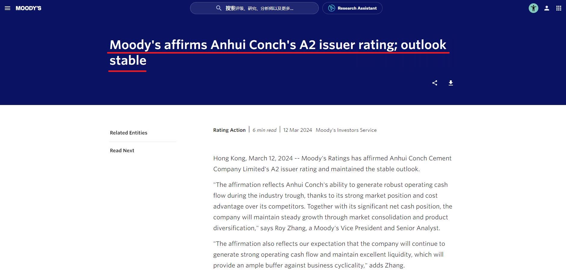 3月12日,國際金融評級機構(gòu)穆迪(Moody’s Ratings)宣布保持安徽海螺水泥股份有限公司A2發(fā)行人評級,評級展望維持“穩(wěn)定”。據(jù)了解這也是全球建材行業(yè)最高評級,而海螺水泥已連續(xù)七年獲此評級。