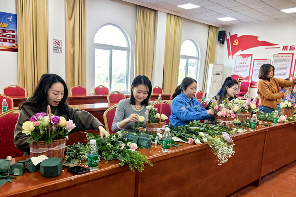 花藝活動正式開始,女員工詳細講解了不同花材的特點及插花的基本技巧,如何根據(jù)花材的高低錯落進行搭配,怎樣通過色彩組合營造出和諧美感等。實操環(huán)節(jié)將活動推向高潮,她們小心翼翼地修剪花枝,精心構(gòu)思每一朵花的擺放位置,將自己對美的理解與情感融入其中。有的員工以玫瑰為主花,搭配上幾枝嫩綠的尤加利葉,打造出熱情而不失清新的作品;還有的員工巧妙運用坦尼克與滿天星,營造出夢幻浪漫的氛圍。在創(chuàng)作過程中,大家相互交流、分享創(chuàng)意,現(xiàn)場歡聲笑語不斷,每一件作品都承載著員工們的獨特創(chuàng)意與美好期許,它們不再僅僅是一束束鮮花,更是員工們內(nèi)心世界的生動表達。