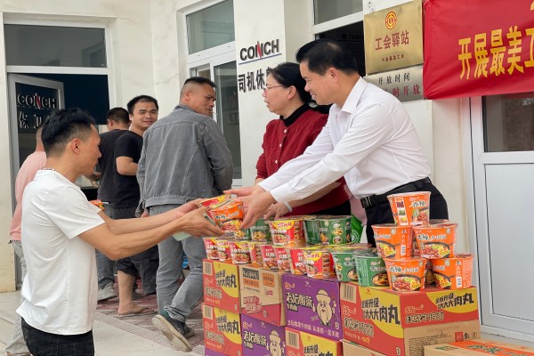 活動當日,興業(yè)海螺和興業(yè)縣總工會的工作人員與志愿者們帶著滿滿的物資抵達骨料司機休息室。一箱箱泡面整齊擺放,為忙碌的骨料司機們提供了便捷的食物補給。司機們在休息間隙收到這份貼心禮物,紛紛露出欣慰笑容。一位骨料司機感慨道:“跑車經(jīng)常錯過飯點,這泡面可真是太及時了,工會想得太周到了。”