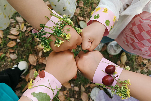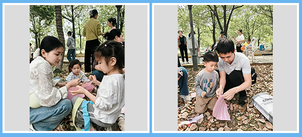 本次活動(dòng)將“親子共讀”與“戶外手工創(chuàng)作”相結(jié)合,在員工閱覽室外,孩子們圍成一圈,以書本為靈感、以自然為素材,共同創(chuàng)作充滿詩意的春日手工藝品。