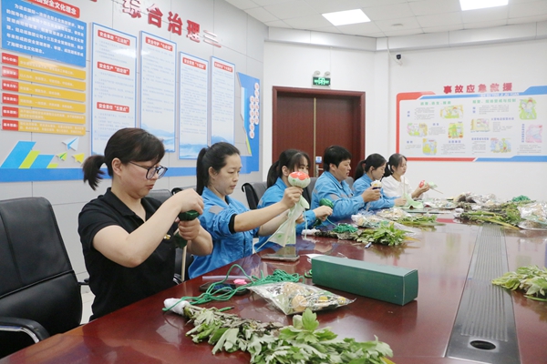 大家先將新鮮的艾草與菖蒲精心搭配,再用寓意吉祥的五彩繩細(xì)細(xì)捆扎。有的職工別出心裁地在門掛上系上親手縫制的香囊,有的則用工整的字跡在紅紙上寫下“平安順?biāo)臁钡淖8UZ掛在艾草枝頭,大家精心捆扎的端午門掛各具特色。有的職工將做好的艾草錘送給長期伏案的同事希望能幫助他緩解疲勞。還有人打算把門掛掛在班組的大門上,希望2025年工作順順利利。