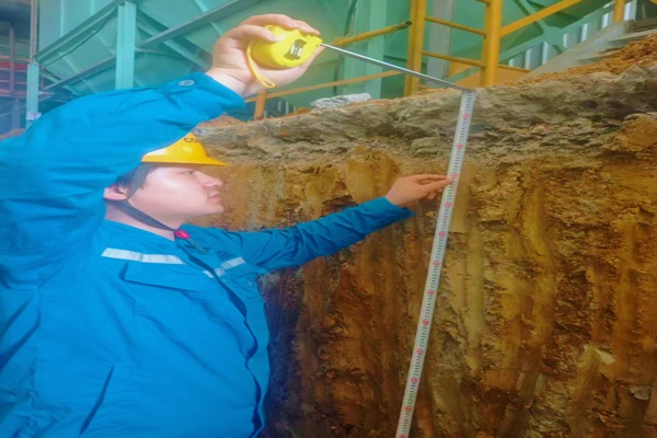 在水泥廠自動(dòng)裝車車道地基破除的周邊,“TA”用心測量著每個(gè)基礎(chǔ)鋼筋的距離,這處地基挖的孔洞明顯向南偏了20公分,那里的預(yù)埋件明顯傾斜不在水平面,“TA”指著孔洞以及前面水平儀上的刻度說,“現(xiàn)在不調(diào)整,等混凝土澆筑后地基不牢固或者偏移過大就是大問題”。