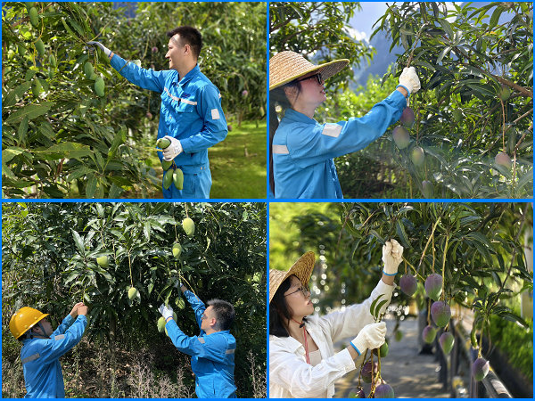 “瞧瞧這大家伙,一個(gè)頂倆!比我的臉還大!”一位員工提起起沉甸甸的金煌芒,笑容如芒果般飽滿。旁邊經(jīng)驗(yàn)豐富的“芒果之鄉(xiāng)”田東縣的同事邊剪邊傳授:“蒂把留一小截,果子更耐放。”新加入的年輕員工起初動(dòng)作略顯生澀,然而幾番嘗試后也漸入佳境,笨拙卻認(rèn)真,汗水混著笑意,映著陽光。銷售處的馮姐捧著自己摘下的貴妃芒,嗅著那獨(dú)特的馥郁香氣,不禁感嘆:“這香氣,比賬本上的數(shù)字更令人心甜呢!”