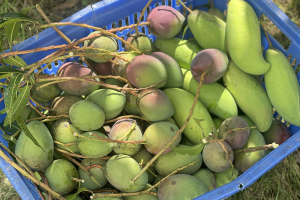 果園內(nèi),各色芒果如同珍寶綴滿枝頭:貴妃芒雍容華貴,金煌芒燦爛輝煌,象牙芒頎長優(yōu)雅,臺(tái)農(nóng)質(zhì)樸可愛,桂七則散發(fā)著獨(dú)屬于百色土地的濃郁醇香。采摘隊(duì)伍穿梭其間,枝葉間“咔嚓”聲此起彼伏,熟透的果實(shí)應(yīng)聲而落。籃筐漸漸豐盈起來,仿佛裝滿了整個(gè)夏天濃縮的甘甜。有人踮起腳尖小心翼翼,有人架起梯子攀援而上,還有人默契配合,接應(yīng)高處摘下的果實(shí)——人聲與果香交織纏繞,讓果園霎時(shí)成了歡樂的流動(dòng)盛宴。